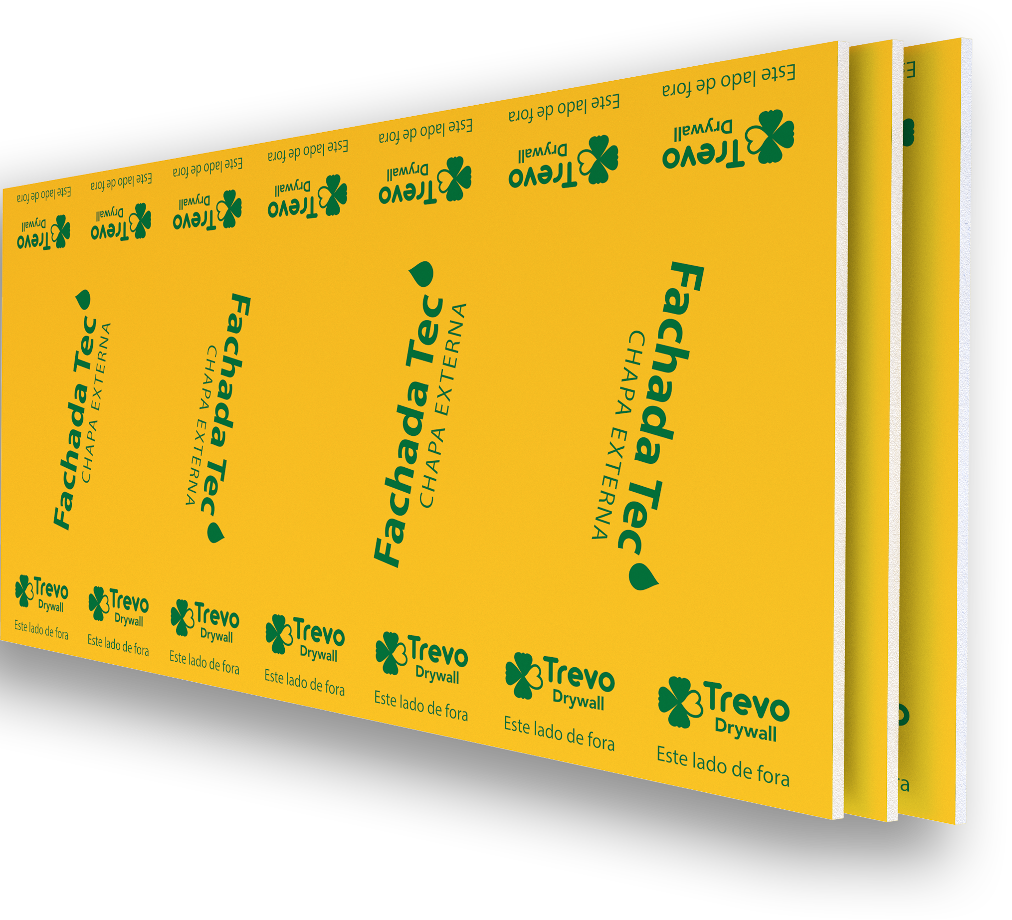 A Fachada Tec é a chapa de gesso para uso externo da Trevo Drywall, com núcleo aditivado e véu de fibra de vidro nas duas faces e nas bordas, o que agrega robustez e prepara a superfície para receber acabamento de forma confiável.